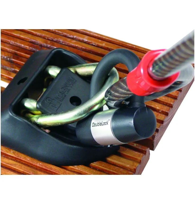 Het Dock Lock van DoubleLock is een solide bevestigingspunt voor op de steiger, op de wal of aan de muur. Het grondanker is erg geschikt voor het vastzetten van kettingen en staalkabels, bijvoorbeeld uit het assortiment van DoubleLock. De meegeleverde veiligheidsbouten die demontage voorkomen door hun slimme ontwerp. De beugel waar je het slot aan bevestigt of doorheen laat lopen is 16mm en kan omhoog klappen.