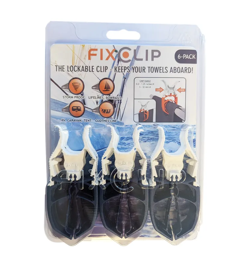 De was droogt sneller als het waait. Maar met de ‘normale’ wasknijper ligt je kleding ook zo maar in het water. De innovatieve FIXCLIP lost het op. De FIXCLIP is een nieuwe en innovatieve afsluitbare knijper die ook bij veel wind doet wat hij moet doen: zorgen dat de was aan boord blijft. Het gepatenteerde dubbele klemsysteem houdt de was vast, ook als het hard waait. Het klembereik van 5-32mm maakt dat de klem praktisch overal aan boord is te gebruiken.