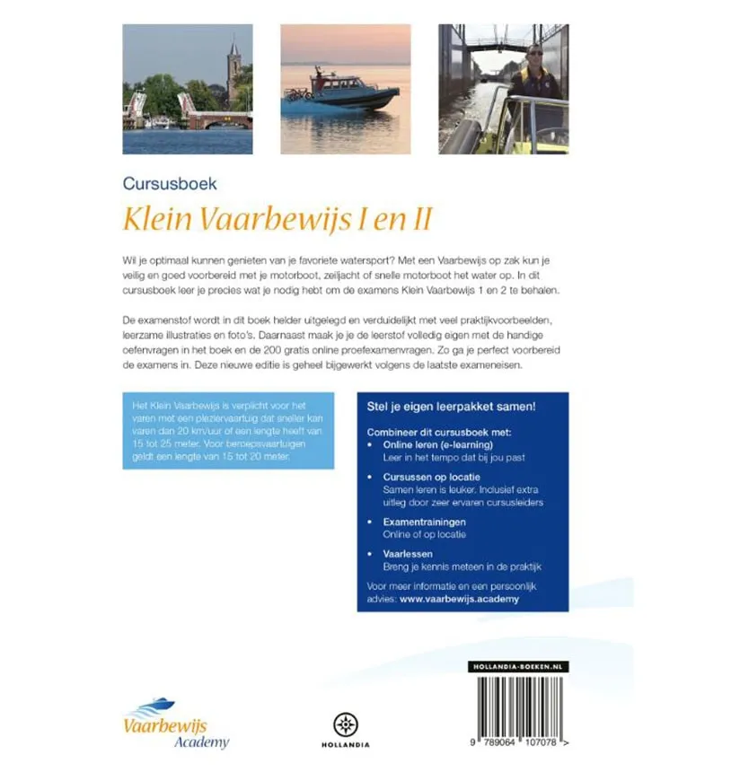 Het Klein Vaarbewijs is verplicht voor het varen met een pleziervaartuig dat sneller kan varen dan 20 km/uur of een lengte heeft van 15 tot 25 meter. Voor beroepsvaartuigen geldt een lengte van 15 tot 20 meter. Stel je eigen leerpakket samen! Combineer dit cursusboek met: • Online leren (e-learning) Leer in het tempo dat bij jou past • Cursussen op locatie Samen leren is leuker. Inclusief extra uitleg door zeer ervaren cursusleiders • Examentrainingen Online of op locatie • Vaarlessen Breng je kennis meteen in de praktijk Voor meer informatie en een persoonlijk advies: www.vaarbewijs.academy.