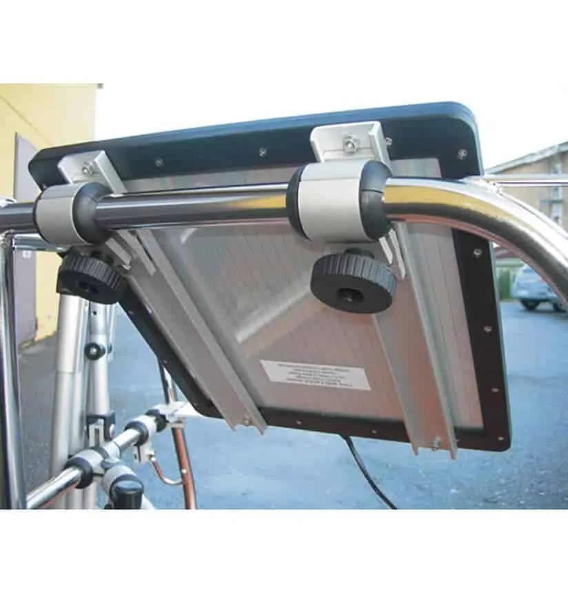 NOA zonnepaneel houder voor gemakkelijke en stevige montage van een zonnepaneel op de hekstoel. De hellingshoek ten opzichte van de zon is volledig verstelbaar en het paneel kan op het frame worden verplaatst om schaduwen te vermijden. Perfect te combineren met de zonnepanelen van Sunpower. De lengte van elke houder is 650mm. Levering is compleet en klaar voor montage incl. NOA fittingen. Vuistregel: geschikt voor maximaal 100 Watt glaspaneel. Bij grotere panelen is het verstandig het paneel met een derde ligger te ondersteunen.
