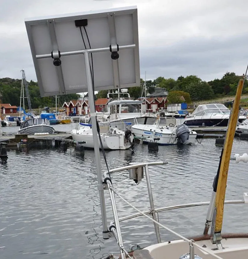 Wil je een zonnepaneel monteren aan de hekstoel, maar heb je daar weinig ruimte? Dan is deze mast met zonnepaneelhouder van NOA de ideale oplossing. De mast neemt praktisch geen ruimte in op de hekstoel en is eenvoudig met de NOA-fittingen te monteren. Doordat het zonnepaneel de hoogte in gaat heeft het paneel minder last van schaduw door tuigage en zeilen, wat de opbrengst van het paneel ten goede komt. De opstelling is eenvoudig zowel verticaal als horizontaal draaibaar waardoor het paneel ook nog eens perfect naar de zon is te richten. De stevige aluminium mast is 180 cm hoog. De 50mm dikke versie is goed te combineren met het 60W Sunpower zonnepaneel