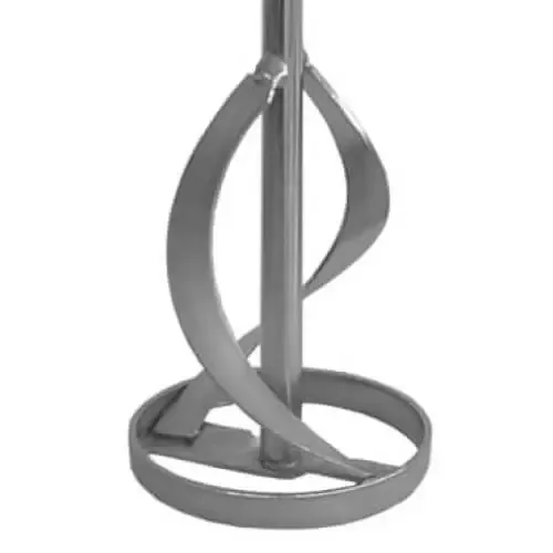 - Het te mengen materiaal wordt door de schoepen naar beneden gedrukt en komt aan de buitenkant van de garde langs de rand van het blik of emmer weer omhoog, waardoor opspatten tot een minimum wordt beperkt.