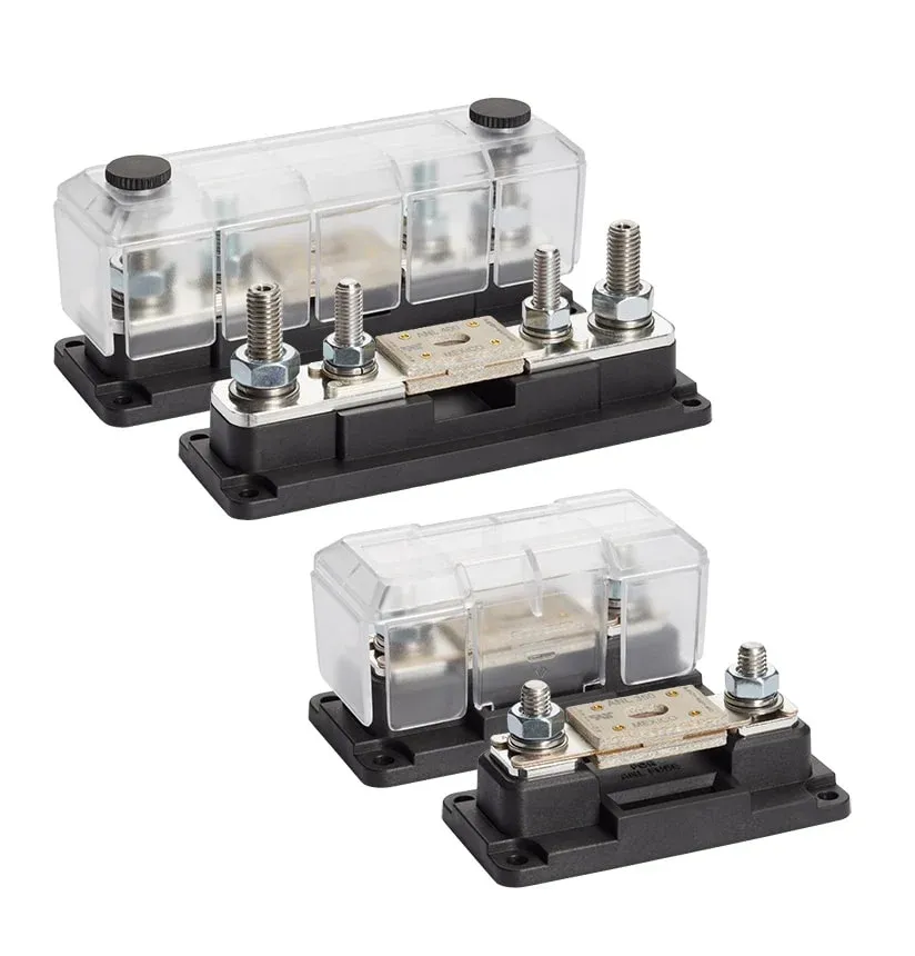 Deze TBS zekeringhouders voor ANL-zekeringen ondersteunt zekeringen met nominale stroomwaarden van 35A tot en met 600A. De zekeringhouder is voorzien van een makkelijk te verwijderen afdekkap. Deze zijn gemaakt van transparant polycarbonaat en heeft verwijderbare zijkanten. Zo kun je kabels vanuit elke richting aansluiten. De kunststof basis is gemaakt van vezel versterkt materiaal en kan tegen hoge temperaturen en chemische invloeden van buitenaf. De bouten (M8 of M10), moeren en ringen zijn hoogwaardig rvs en bieden optimale weerstand tegen corrosie, ideaal voor aan boord.
