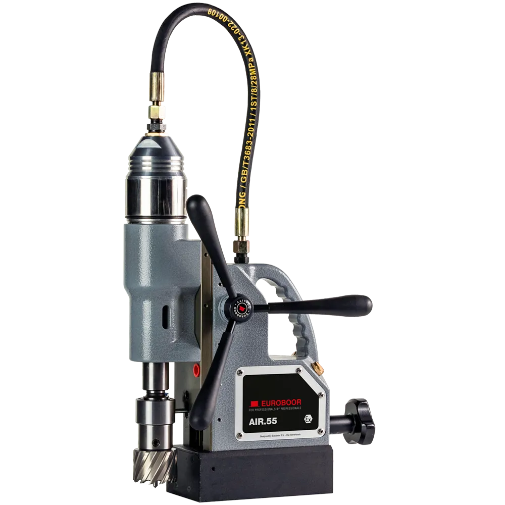 De draagbare Euroboor AIR.55 pneumatische boormachine is uitgerust met een lucht aangedreven, vonkvrije motor en een niet-elektrische, permanente magneetvoet. Aangesloten op een compressor, kan de machine worden gebruikt voor het boren op vlakke werkstukken waar elektrische machines minder handig of niet toegestaan zijn, vooral in gebieden en ruimtes met potentieel explosieve atmosferen, zoals offshore en petrochemische industrieën, evenals mijnen.