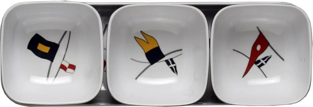Een feestje aan boord? Serveer je snacks in deze feestelijke snackschaaltjes. De set bestaat uit een langwerpige schaal met daarin drie vierkante schaaltjes. Alles is gemaakt van melamine en daardoor onbreekbaar. De signaalvlaggen waarmee deze set is versierd, zien we ook terug op de andere serviesonderdelen uit de Regata-serie van Marine Business. Voor een compleet servies combineer je deze snackset met de melamine borden, onbreekbare glazen en de serveerschalen van Regata. Het Regata-servies is geschikt voor de vaatwasser. Deze serie is BPA vrij.